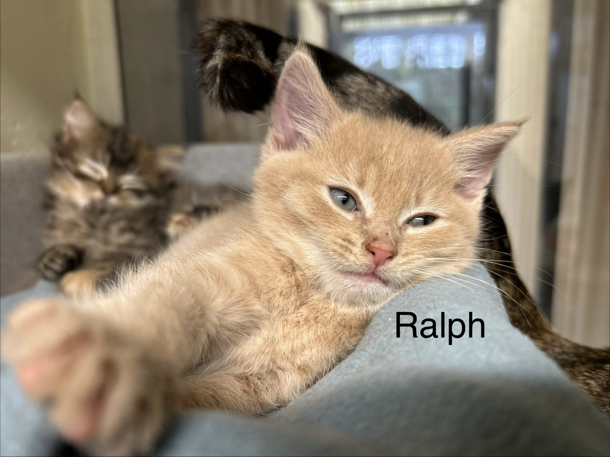 Ralph and Pip were born here at the centre after their mum ( Olivia ) was brought to us via an inspector heavily pregnant. Olivia has done the most fantastic job raising her babies and they have grown into wonderful, healthy and happy kittens.