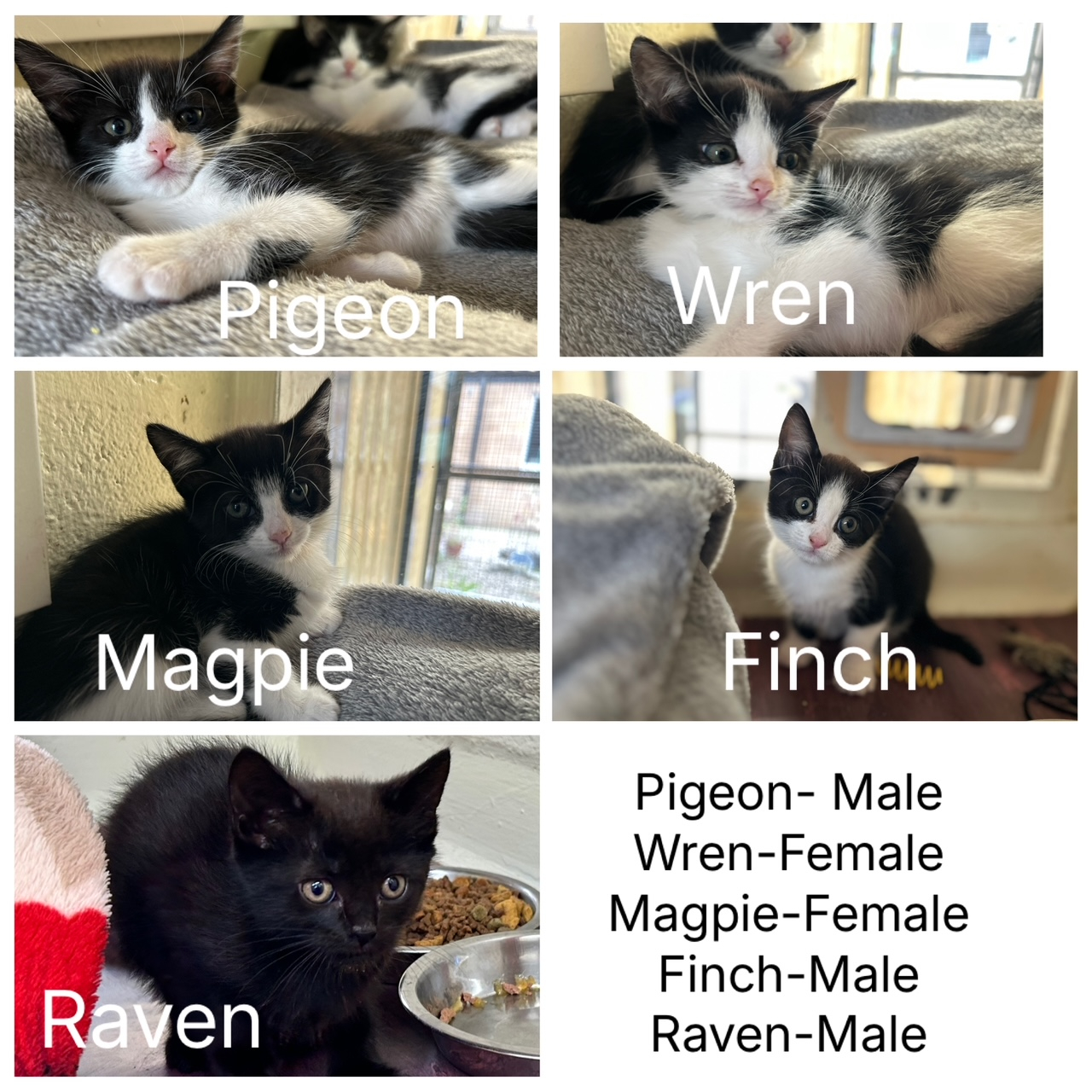 Can you help Raven , Pigeon, Wren, Magpie & Finch find a home?